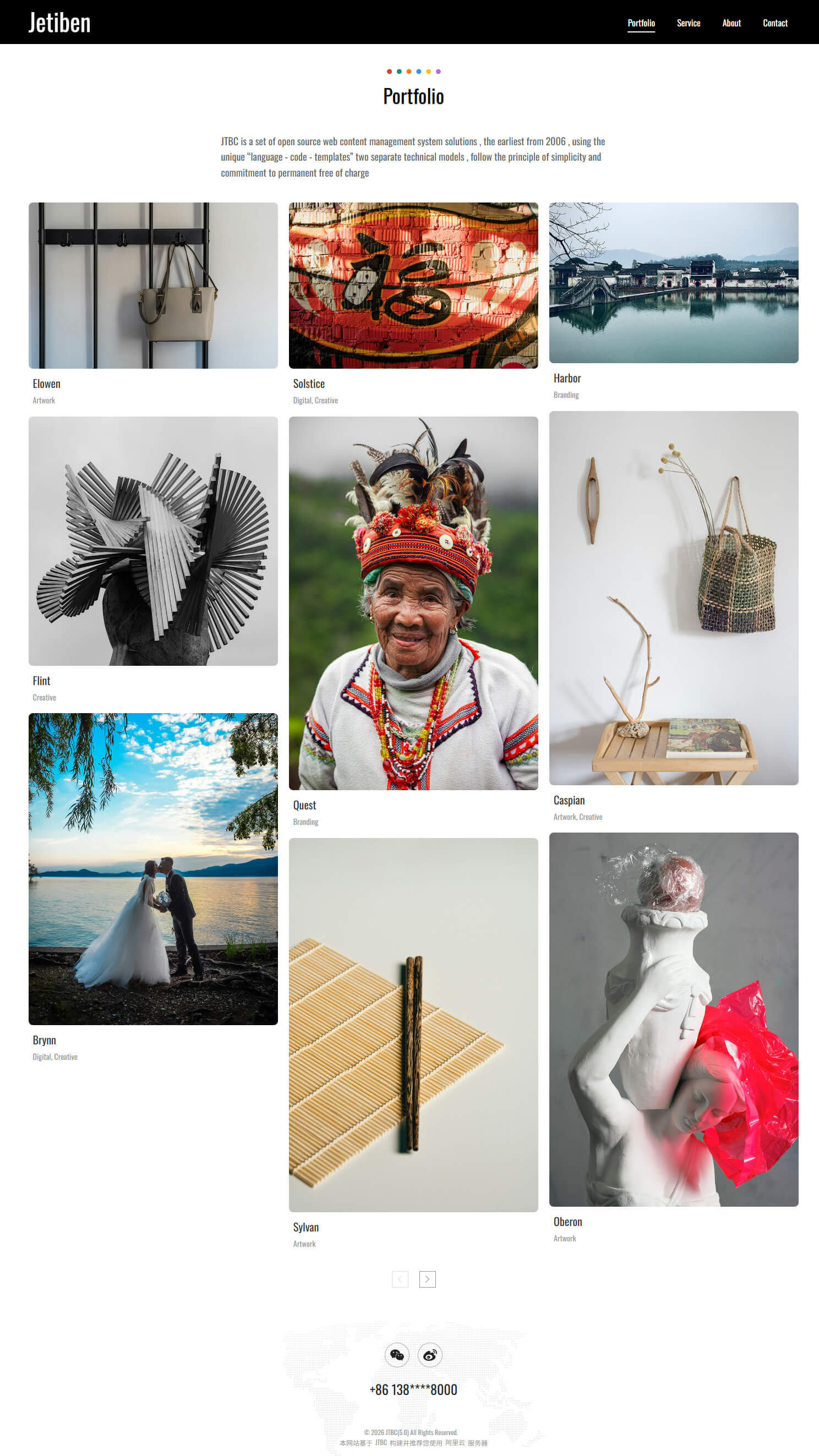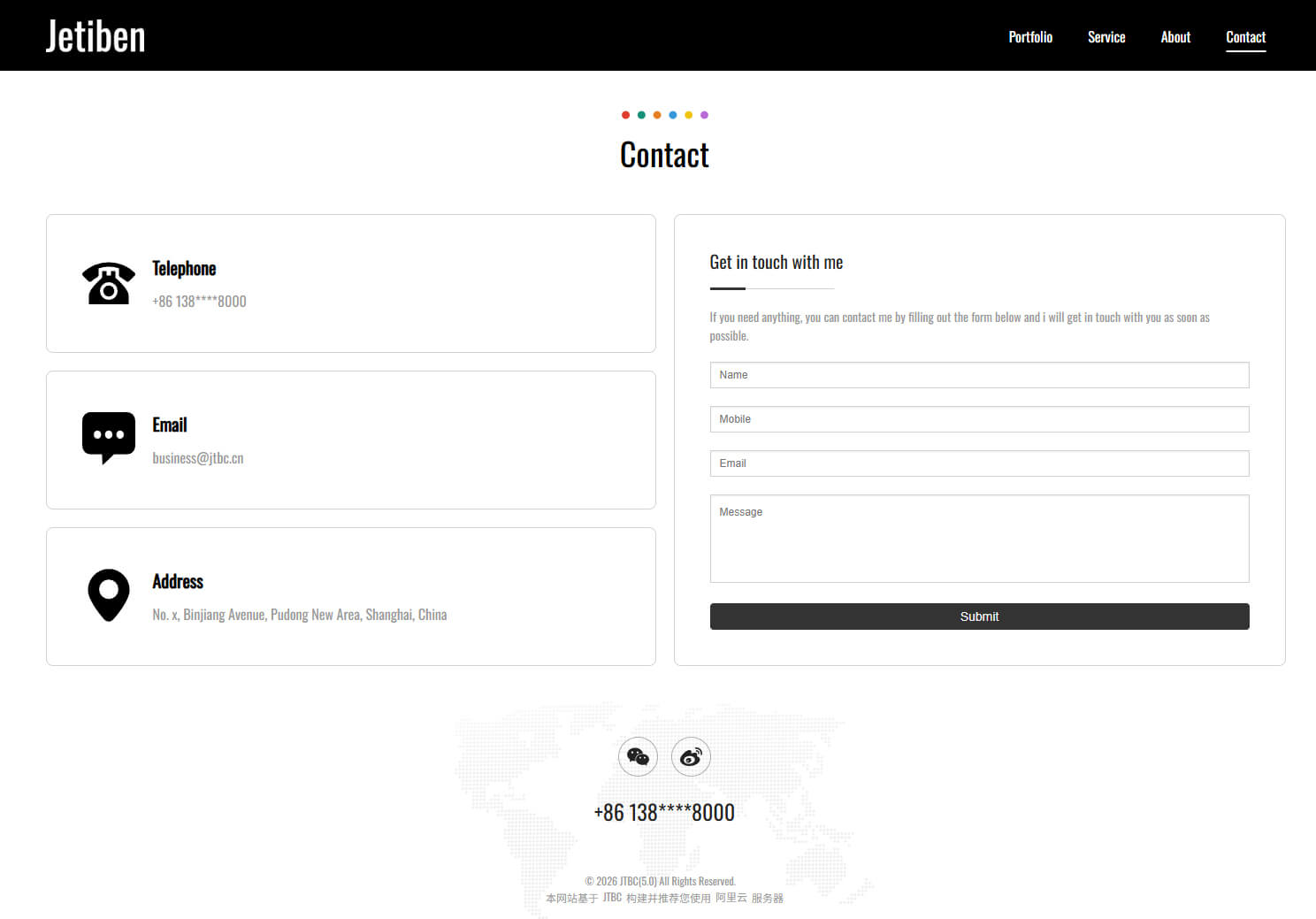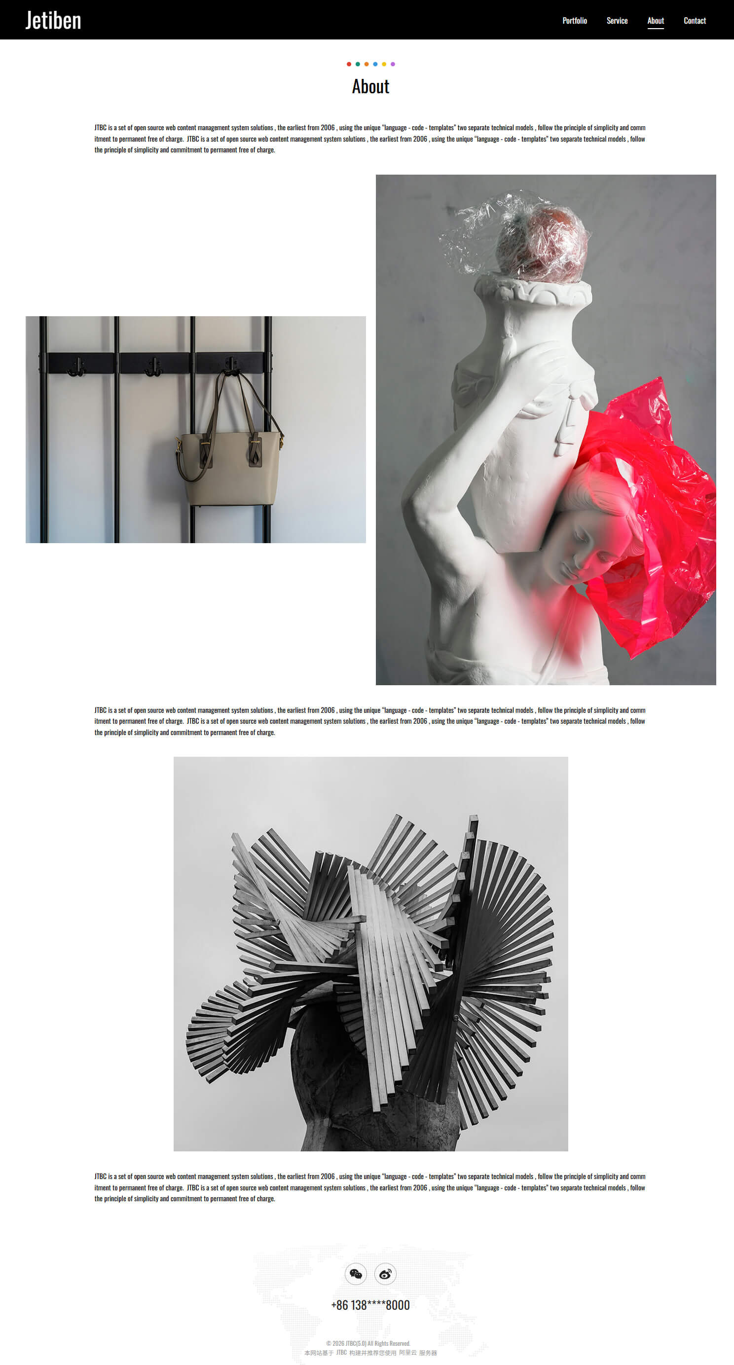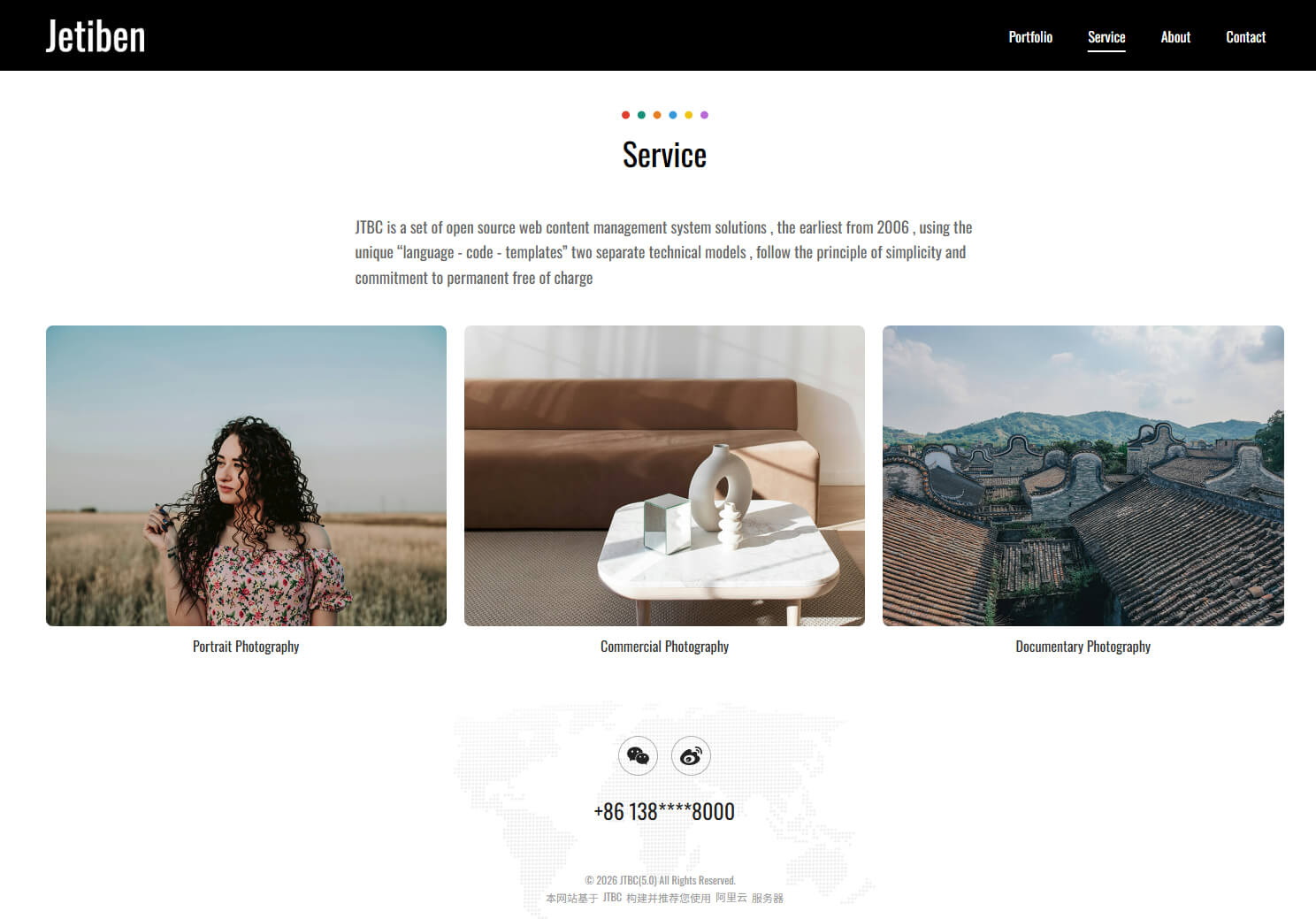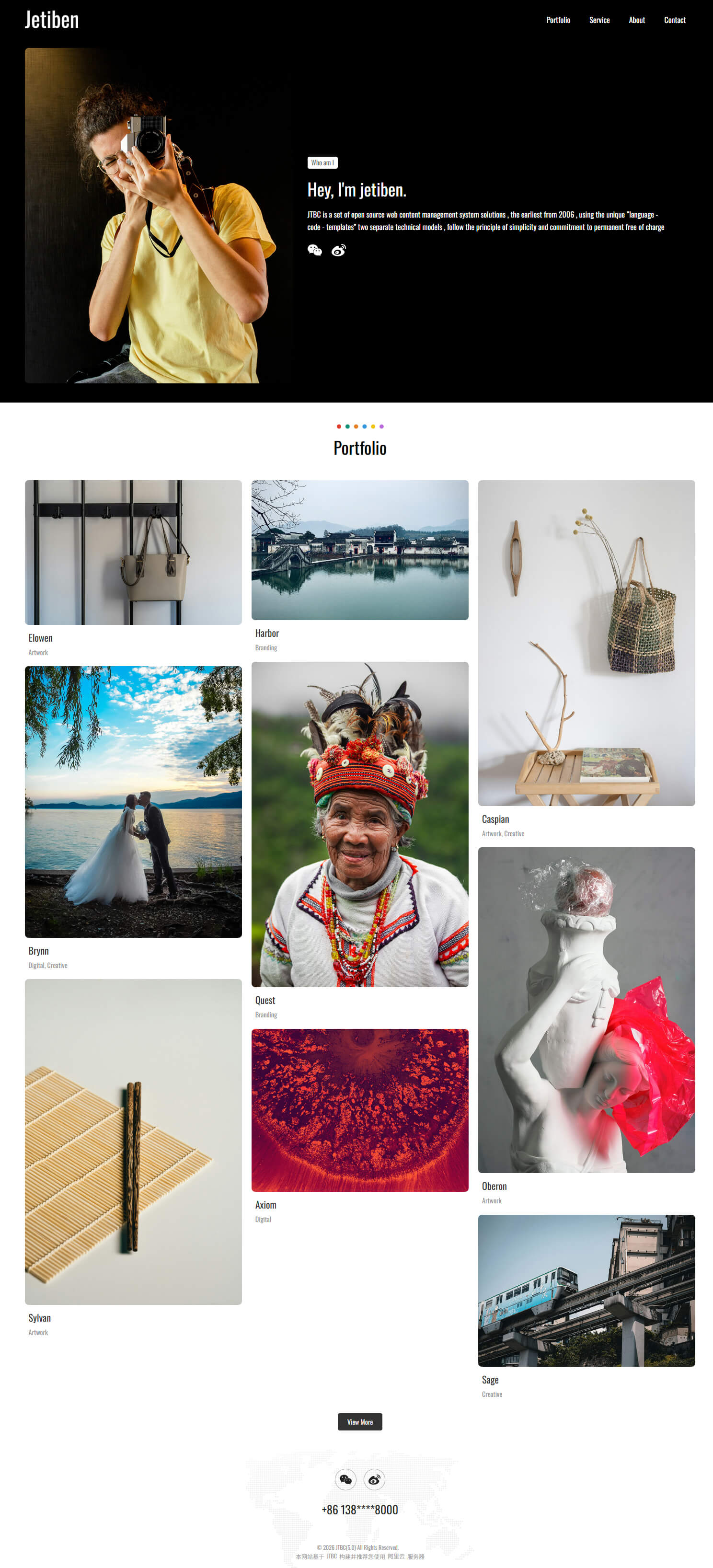 - 具备"Portfolio, Service, About, Contact"等栏目