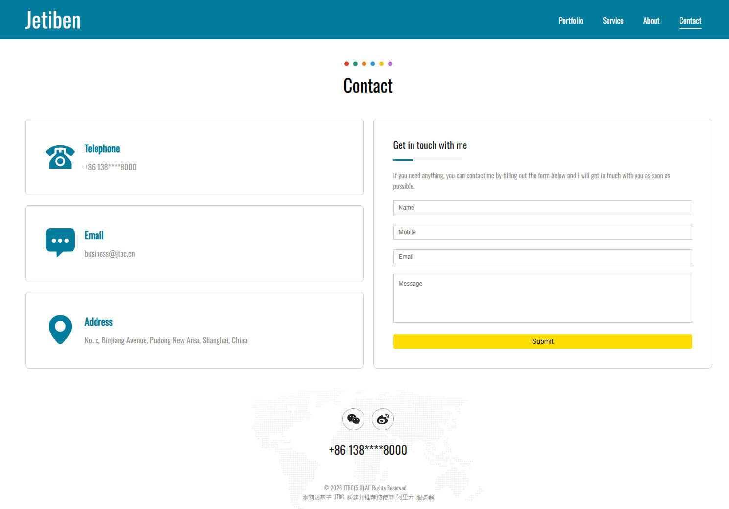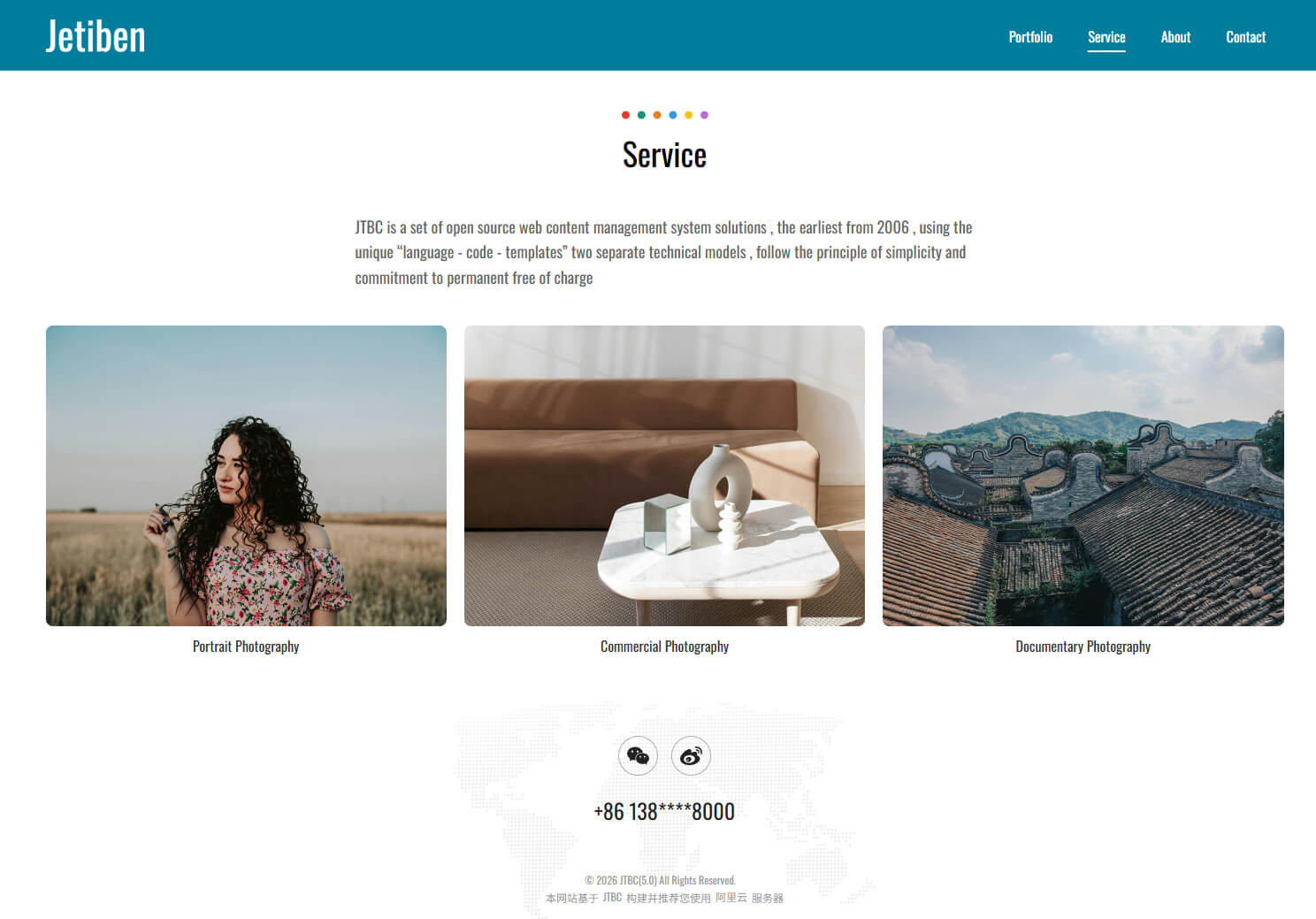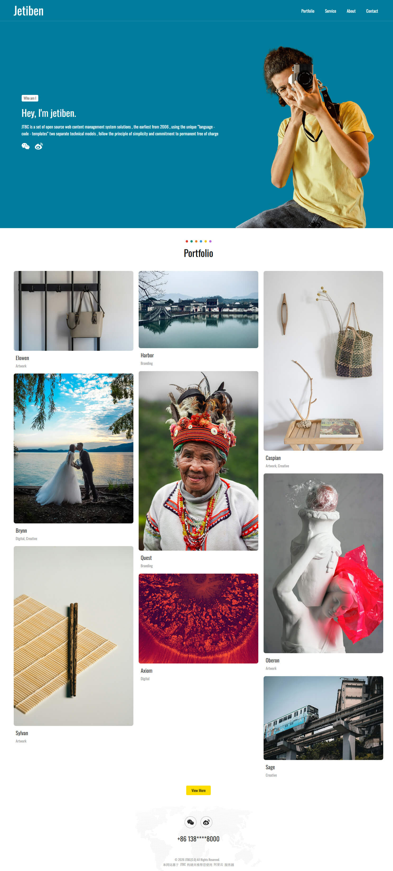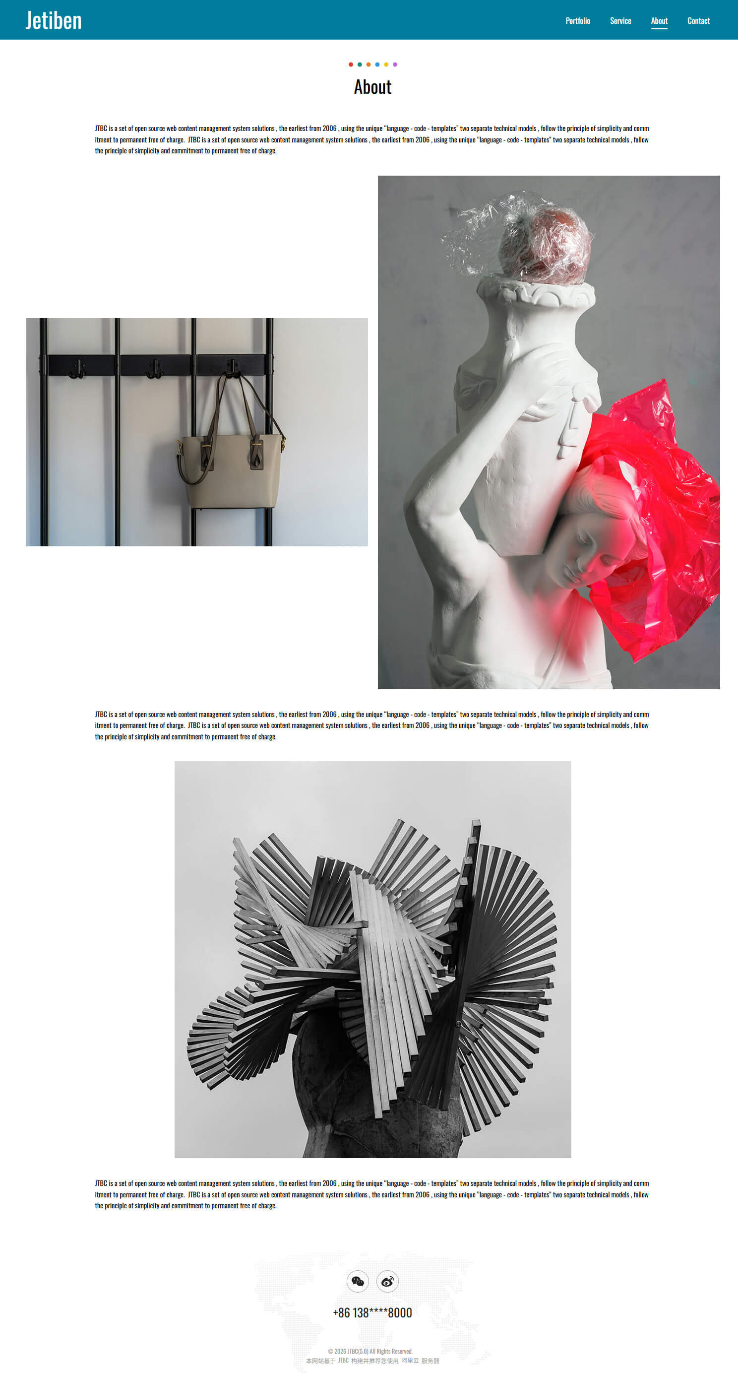 - 具备"Portfolio, Service, About, Contact"等栏目