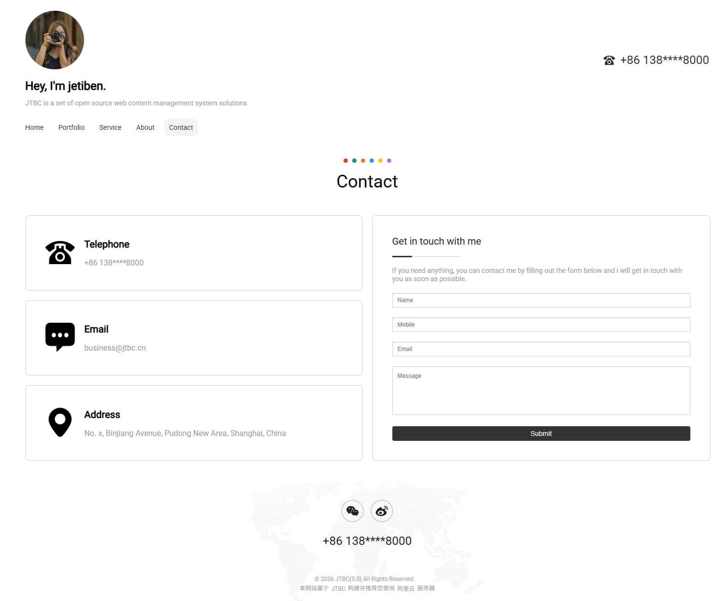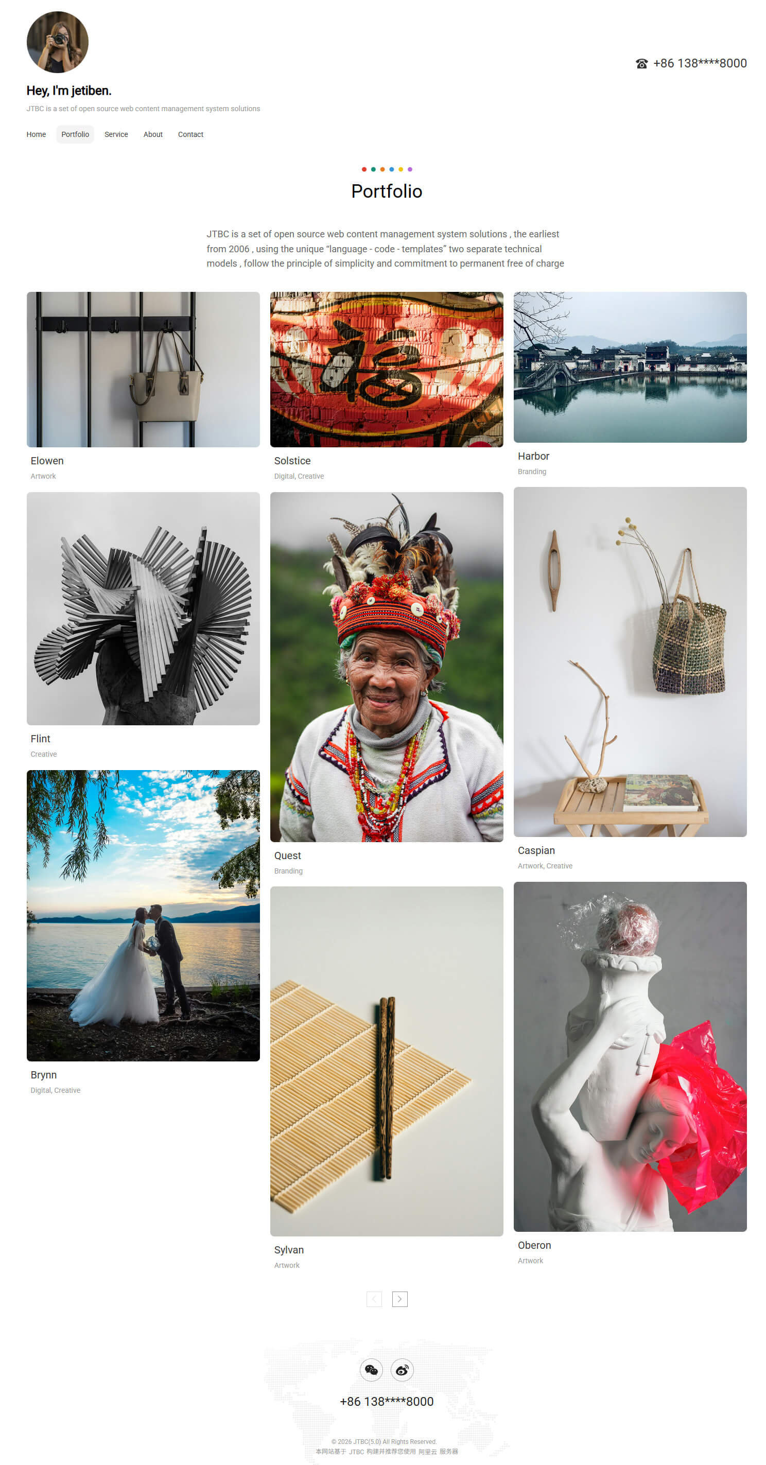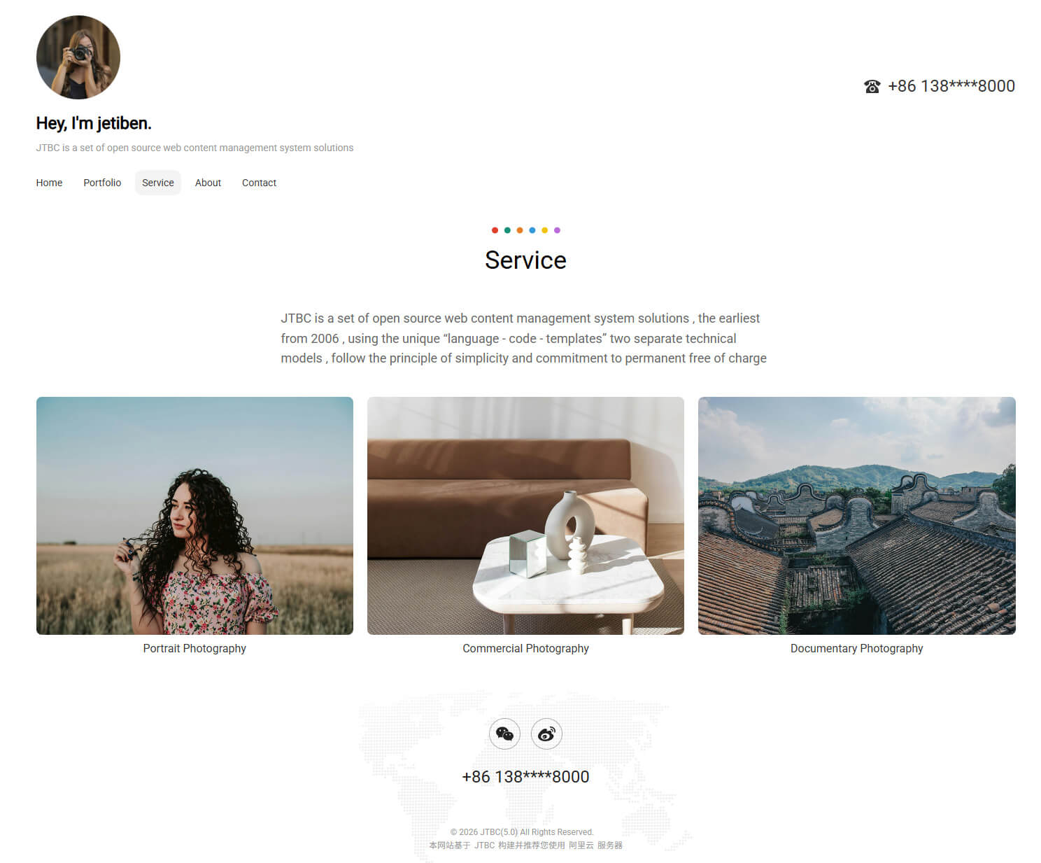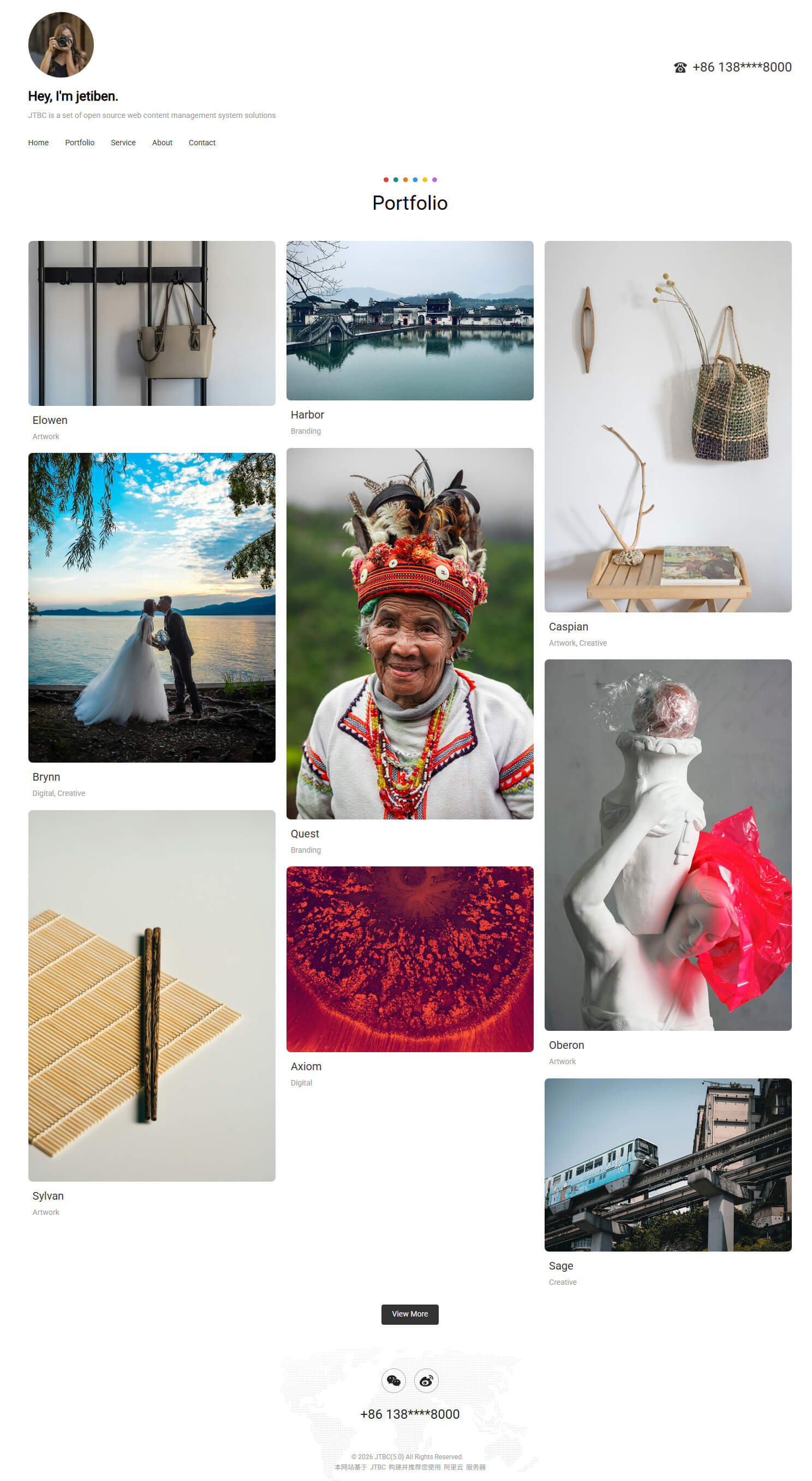 - 具备"Portfolio, Service, About, Contact"等栏目