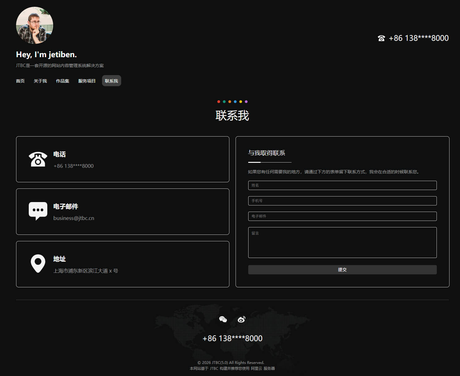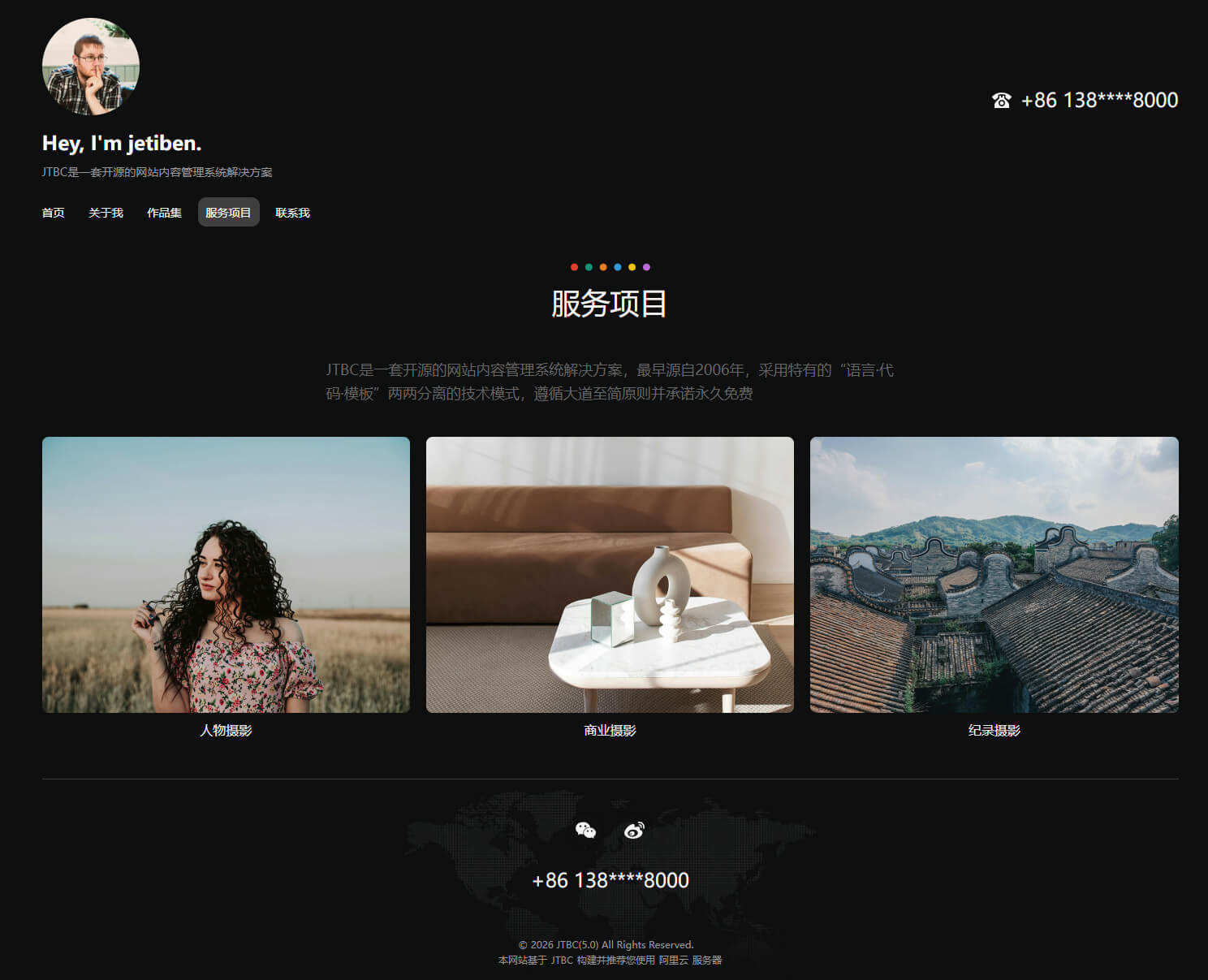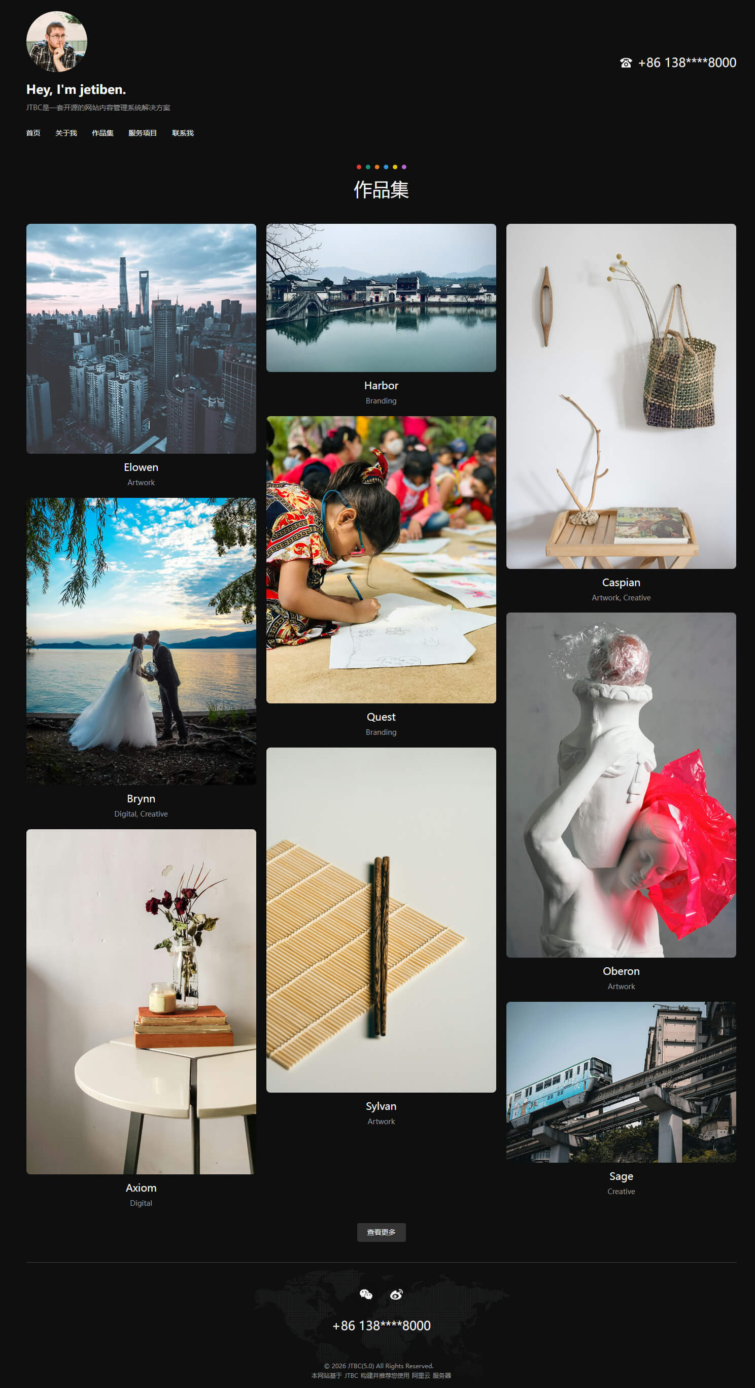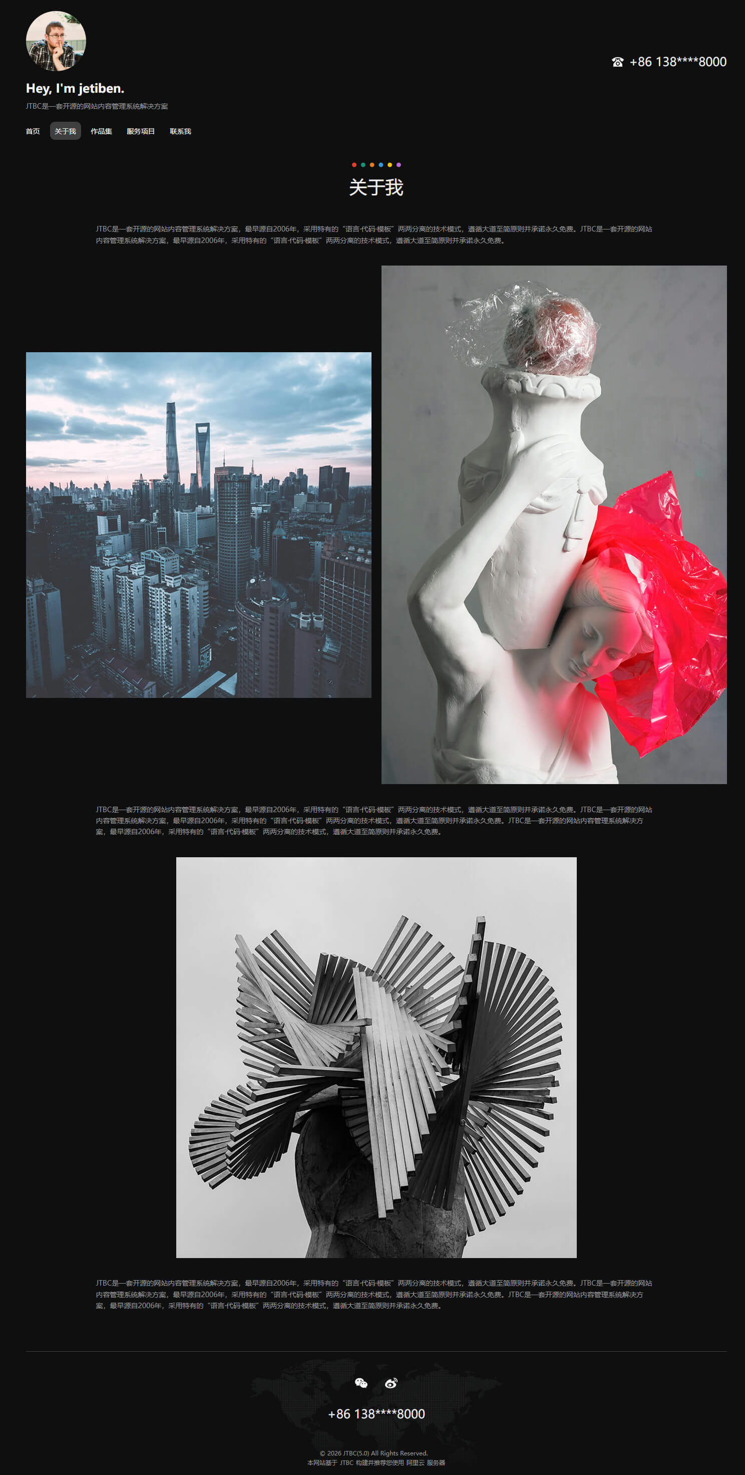 - 具备"关于我、作品集、服务项目、联系我"等栏目
